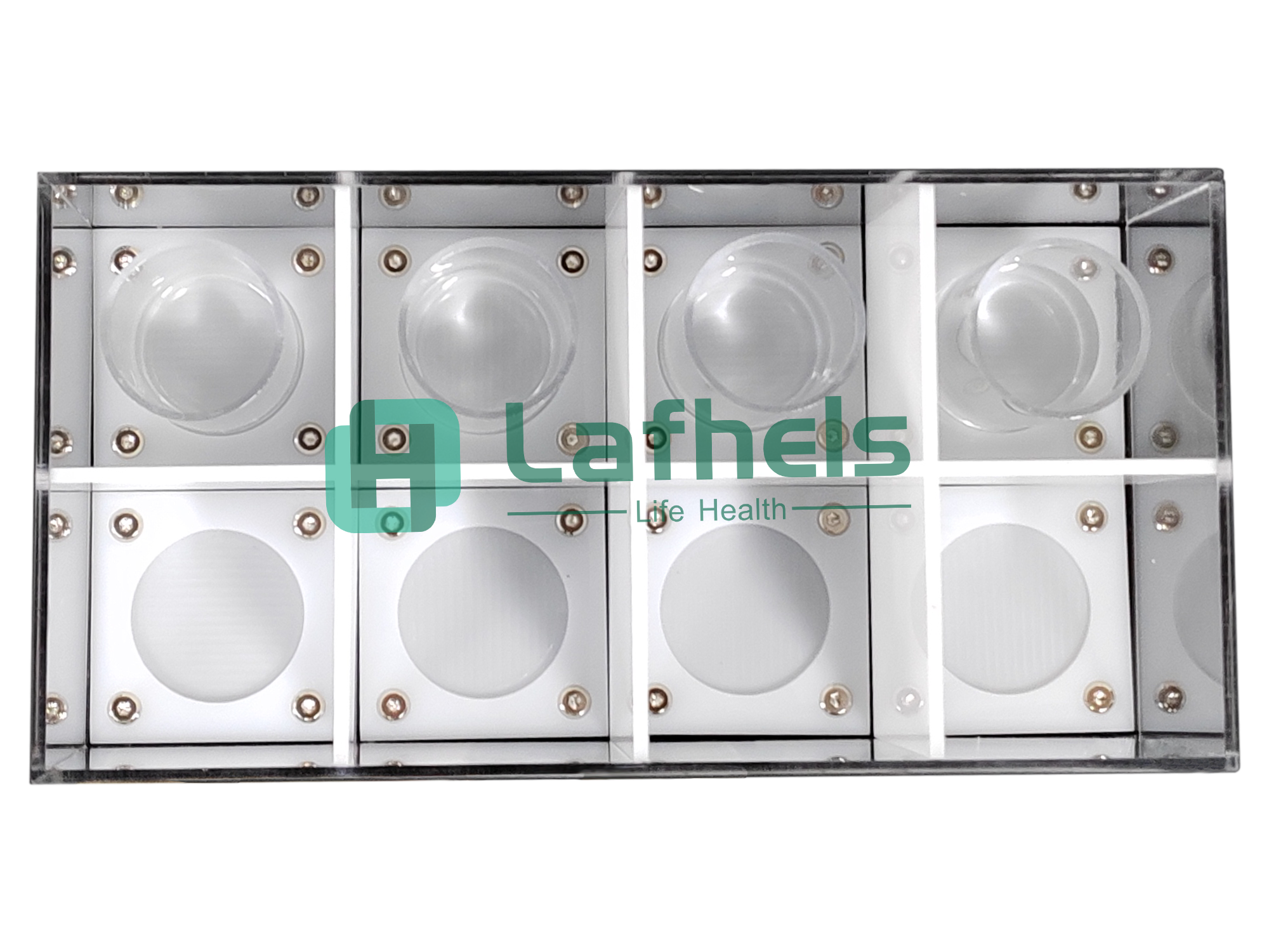 通道规格:每个隔间为90mm*90mm,每个通道含一个透明圆柱体容量杯,直径为60mm